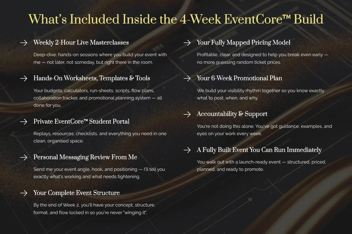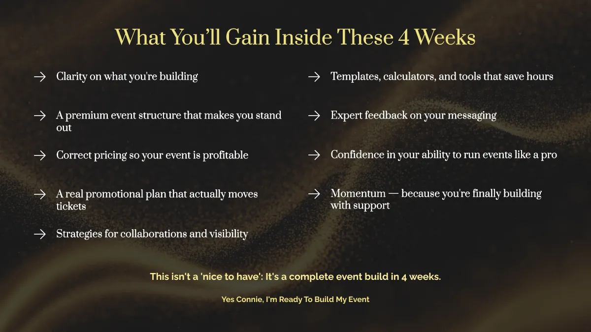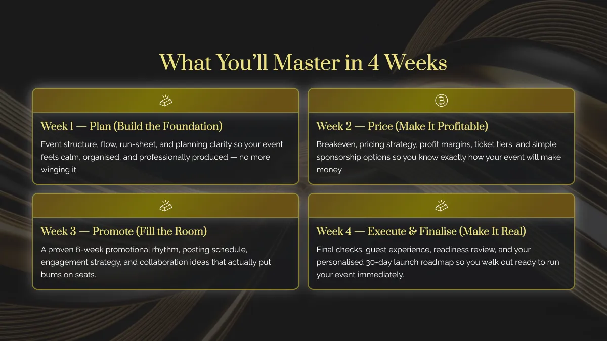 Yes, simple, practical tasks each week so the event is progressively built throughout the program.